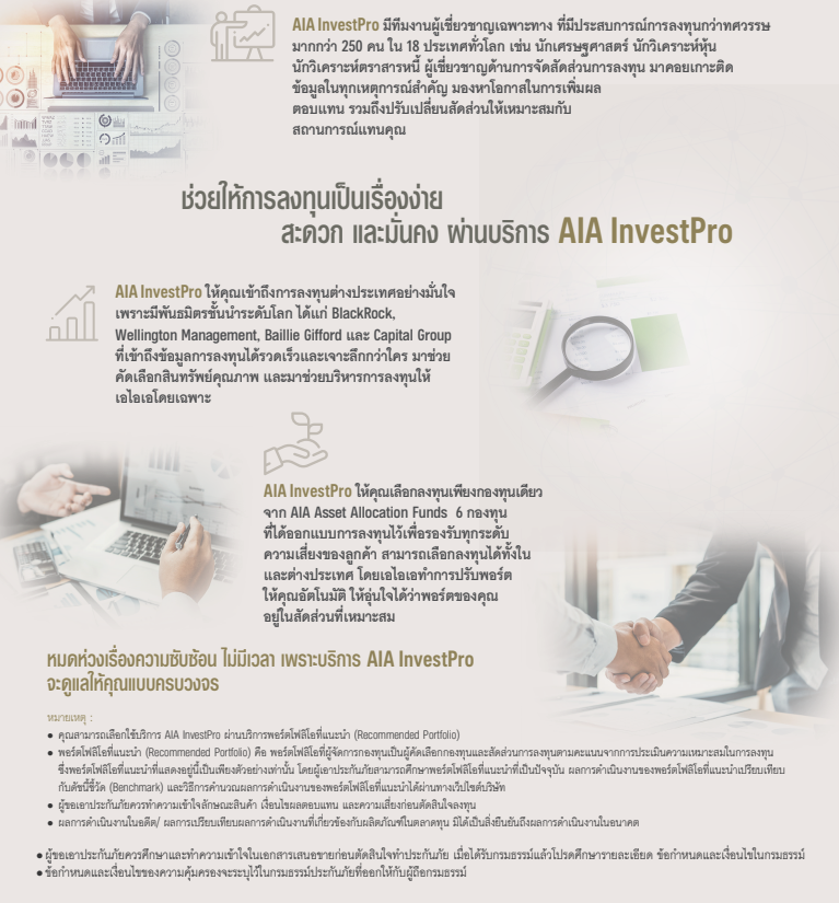 คือการดูแลการลงทุนแบบครบวงจรที่ครอบคลุมทั้งการวางแผน วิเคราะห์ ปรับพอร์ต เพื่อโอกาสรับผลตอบแทนที่สูงขึ้น ให้คุณมั่นใจได้ว่าเงินทุกบาทที่คุณหามา จะได้รับการดูแลอย่างดีโดยมืออาชีพ ให้คุณใช้ชีวิตตามที่ต้องการ โดยมี AIA InvestPro ดูแลคุณตลอดเส้นทางการลงทุนไปสู่เป้าหมายการเงินที่ตั้งเอาไว้